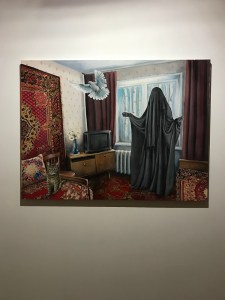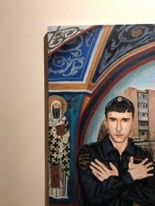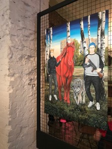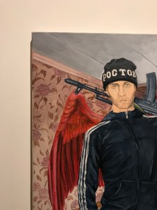 I got to see his exhibition “I Like You” at the Gogol Center in Moscow in November. Run by another Rostov-born cultural daredevil Kirill Serebrennikov, it is “the city inside a theater, the theater inside a city, the territory of freedom”. The works seemed out-of-place in the busy lobby, but then again… where would YOU hang these?! The paintings ooze existential bewilderment. What’s Islamophobic about homo-eroticism? Is domestic violence an Orthodox Christian rite? Could I be buried in an Adidas-branded casket? Wait, what?!! Rachuiko delivers stupefaction. “With his arrogant claim to high art, his incredible impudence in equating the ‘base’ with the ‘eternal’, this phony artist can’t fail to contaminate us with his intensity.” And that is a curatorial note! On social media, he often shares best-of comments from viewers who “just can’t” with his triggering art.
